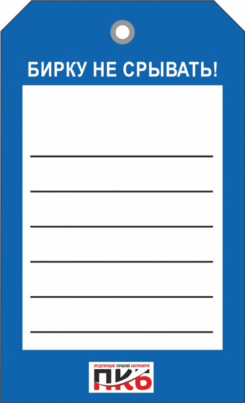 Информационная бирка пролинованная для заполнения. Изготовлена из пластика ПВХ, толщиной 0,3 мм, без ламинации, диаметр отверстия 7 мм. По желанию заказчика толщина бирки может быть увеличена до 1-2 мм. Нанесение текста необходимо производить маркером или шариковой ручкой. Размер 70 х 115 х 0,3 мм.