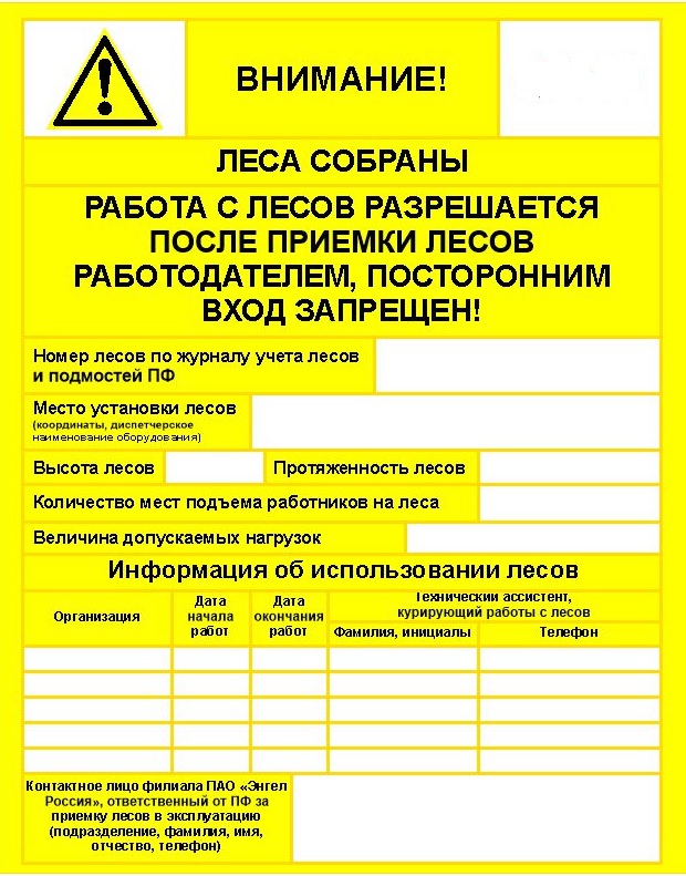 - Желтая бирка, размещенная на помосте, указывает на то, что помост был сконструирован не по норме, чтобы соответствовать определенным условиям работы или требованиям. Необходимо сделать все возможное, чтобы как можно скорее восстановить желтую метку до зеленой метки.