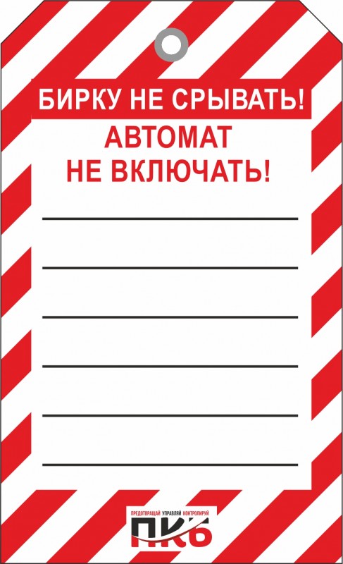 Информационная бирка "Автомат не включать", арт. PKBS103, для одноразового использования, односторонняя. Изготовлена из пластика, толщиной 0,3 мм, оснащена металлическим люверсом Ø 8 мм . По желании заказчика толщина бирки может быть увеличена до 1-2 мм. Нанесение текста можно производить маркером или ручкой. Размер 70 х 115 х 0,3мм.